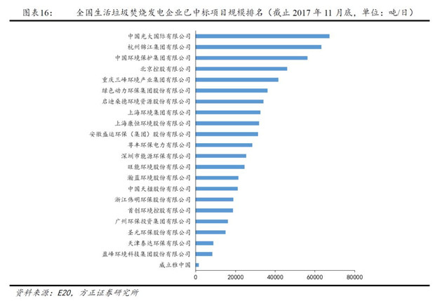 根據(jù)E20研究院統(tǒng)計排名,截止2017年11月底,已中標(biāo)的垃圾焚燒發(fā)電項目規(guī)模前五企業(yè)項目規(guī)模占比達到 42.26%,規(guī)模前十企業(yè)項目規(guī)模占比達到67.86%,行業(yè)市場集中度較高。