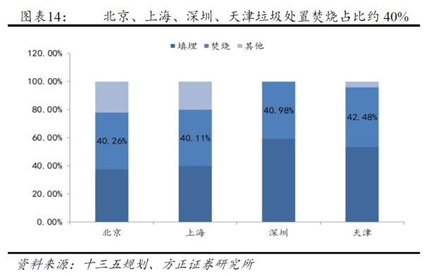 而從北京、上海、深圳、天津等大城市的生活垃圾處置能力來看,目前焚燒占比約40%,隨著早期填埋場的滿產(chǎn)及土地資源的稀缺,大型城市生活垃圾焚燒處置將是大勢所趨。