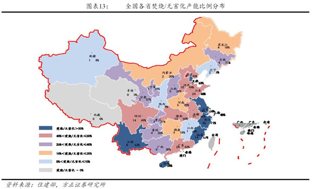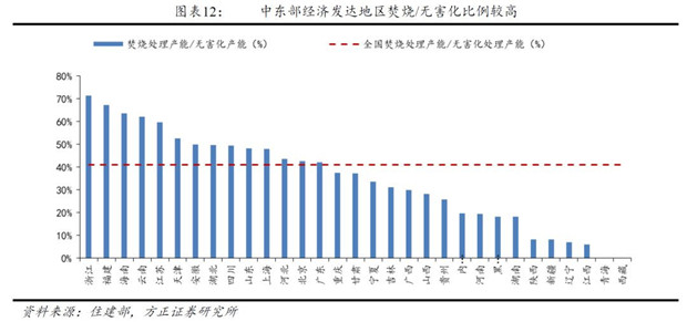 從焚燒處理占無害化產(chǎn)能比例來看,2016年全國焚燒處理占無害化處理比例為41%,全國有14個省焚燒處理占無害化處理比例超過該比例,且大多分布在中東部經(jīng)濟發(fā)展程度較高的地區(qū),其中浙江省焚燒處理占無害化處理比例最高,達到了71%。