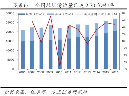 從生活垃圾產(chǎn)量角度,隨著我國城鎮(zhèn)化進程的推進,城市生活垃圾清運量逐年增長,2016年生活垃圾清運量已經(jīng)達到2.70億噸,其中城市生活垃圾清運量2.03億噸,縣城生活垃圾清運量0.67億噸,并在以每年4%-5%的增速逐年攀升。