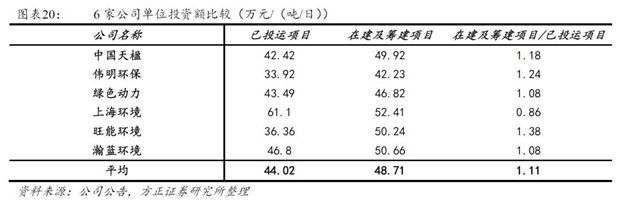 在建及籌建項目中,按照單位投資額由低到高依次為:偉明環(huán)保、綠色動力、中國天楹、旺能環(huán)境、瀚藍環(huán)境、上海環(huán)境。