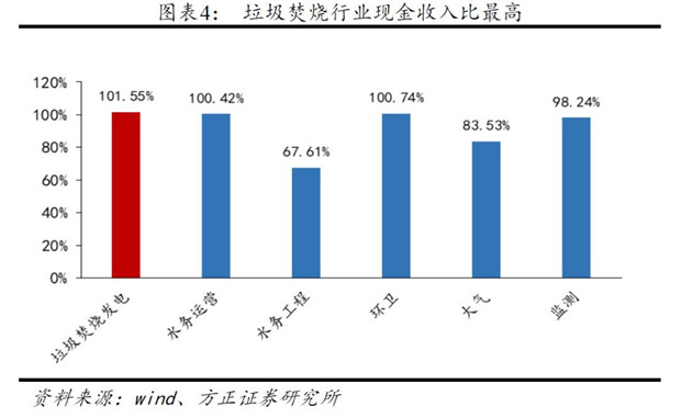 從現(xiàn)金收入比來看,2017年垃圾焚燒發(fā)電現(xiàn)金收入比101.55%,高于其他細分行業(yè),表現(xiàn)出運營類業(yè)務(wù)良好的現(xiàn)金流情況。