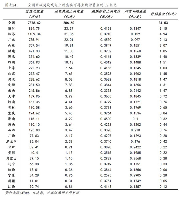 按照2016年各省垃圾焚燒處置量,噸垃圾上網(wǎng)電量280度測算,全國垃圾焚燒發(fā)電上網(wǎng)需要可再生能源基金約32億元。