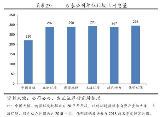 行業(yè)平均噸垃圾發(fā)電量為280-400度,其中自用電比例約20%,單位垃圾上網(wǎng)電量約220-300度,不同項目間差異性較大。我們根據(jù)已披露的公開信息得到部分公司單位垃圾發(fā)電量數(shù)據(jù):