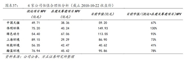 在建項目建成投運是垃圾發(fā)電企業(yè)未來3年可預(yù)期的成長來源,我們以在運項目的運營能力為參照,預(yù)測在建項目建成投運后的經(jīng)營情況,通過在建項目NPV/已投運項目NPV的指標(biāo)來表現(xiàn)公司成長性,成長性由高到低依次為:綠色動力、中國天楹、旺能環(huán)境、偉明環(huán)保、瀚藍環(huán)境、上海環(huán)境。通過目前市值/(在建項目+已投運項目)NPV指標(biāo)來衡量上市公司目前的估值水平,垃圾焚燒項目估值由高到低依次為偉明環(huán)保、綠色動力、瀚藍環(huán)境、上海環(huán)境、中國天楹、旺能環(huán)境。