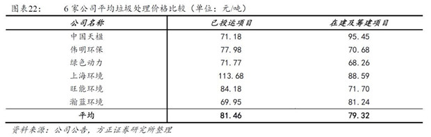 我們根據(jù)上市公司公開披露的項目信息統(tǒng)計,取各個項目垃圾處置價格的平均值,對6家A股上市公司進行比較。已投運項目平均處置價格81元/噸,在建及籌建項目平均處置價格79元/噸,行業(yè)競爭激烈導(dǎo)致行業(yè)整體垃圾處置價格有所下降。