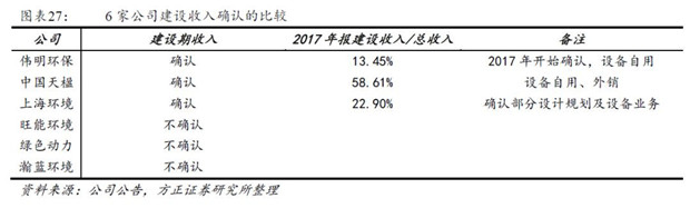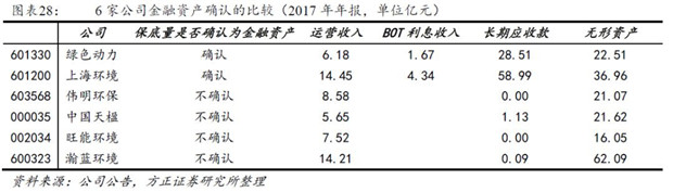 6家上市公司中,綠色動力、上海環(huán)境將保底垃圾處置費確認為金融資產(chǎn)-長期應(yīng)收款,建設(shè)投資剩余部分確認為無形資產(chǎn)-特許經(jīng)營權(quán);而偉明環(huán)保、中國天楹、旺能環(huán)境、瀚藍環(huán)境將全部建設(shè)投資轉(zhuǎn)入無形資產(chǎn)。
