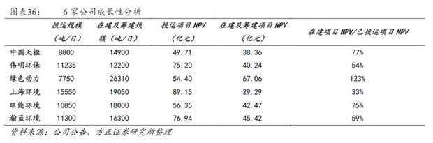 通過在建及籌建項目NPV/已投運項目NPV的指標(biāo)來表現(xiàn)公司成長性,成長性由高到低依次為:綠色動力、中國天楹、旺能環(huán)境、偉明環(huán)保、瀚藍環(huán)境、上海環(huán)境。