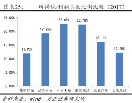 因此,根據(jù)項目投運時間不同,各公司的所得稅率存在一定差異。我們比較了6家上市公司合并報表層面的所得稅/利潤總額比例,其中偉明環(huán)保最低,為11.95%,主要是由于新投運的永強二期項目貢獻凈利潤較多;中國天楹最高,為22.68%,公司海外子公司的所得稅率較高所致。