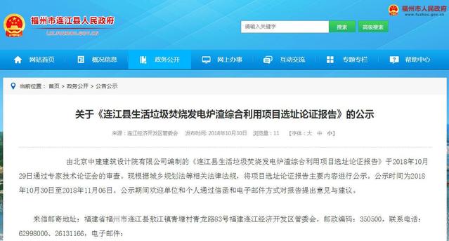 2018年10月30日,福州市連江經(jīng)濟開發(fā)區(qū)管委會公示《連江縣生活垃圾焚燒發(fā)電爐渣綜合利用項目選址論證報告》。