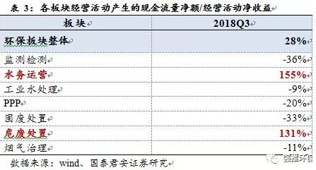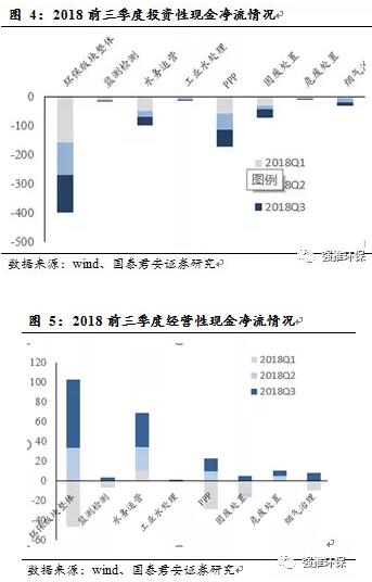 經(jīng)營現(xiàn)金流凈額方面:2018前三季度,環(huán)保行業(yè)整體凈額為55.9億元,受益于水務(wù)運營與危廢處置板塊,現(xiàn)金流超前于收入確認(rèn)的行業(yè)屬性,其他板塊,現(xiàn)金流與收入的匹配性仍有待提高。
