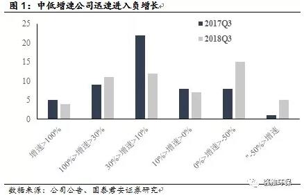 將板塊內(nèi)55個標(biāo)的2017Q3與2018Q3扣非凈利潤增速,列示如圖2與圖3。其中,中低增速區(qū)間的公司(增速10%~30%)顯著減少,進(jìn)入負(fù)增長的企業(yè)顯著增多。不同企業(yè)之間的分化愈演愈烈。