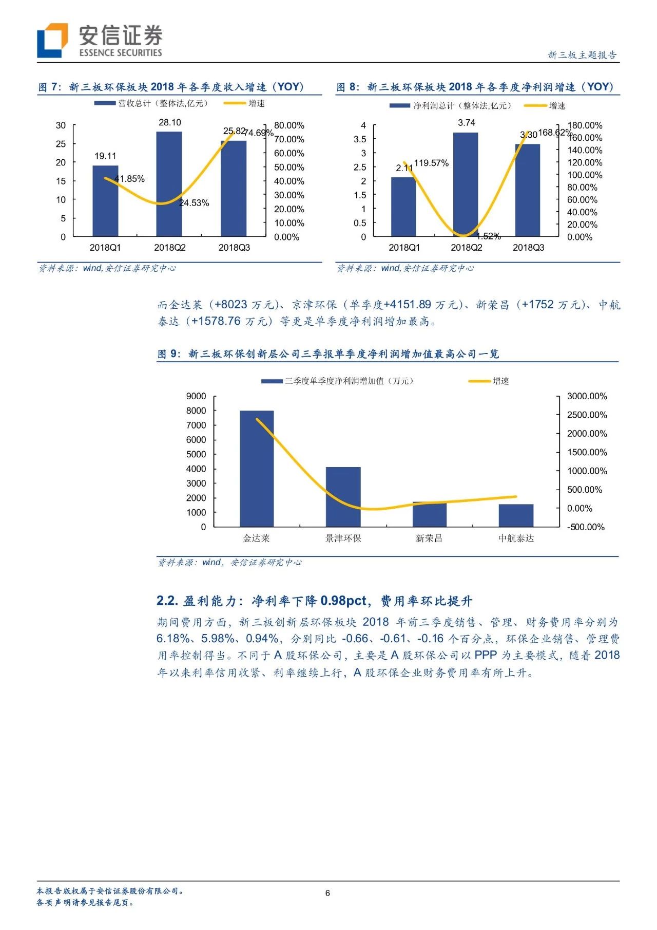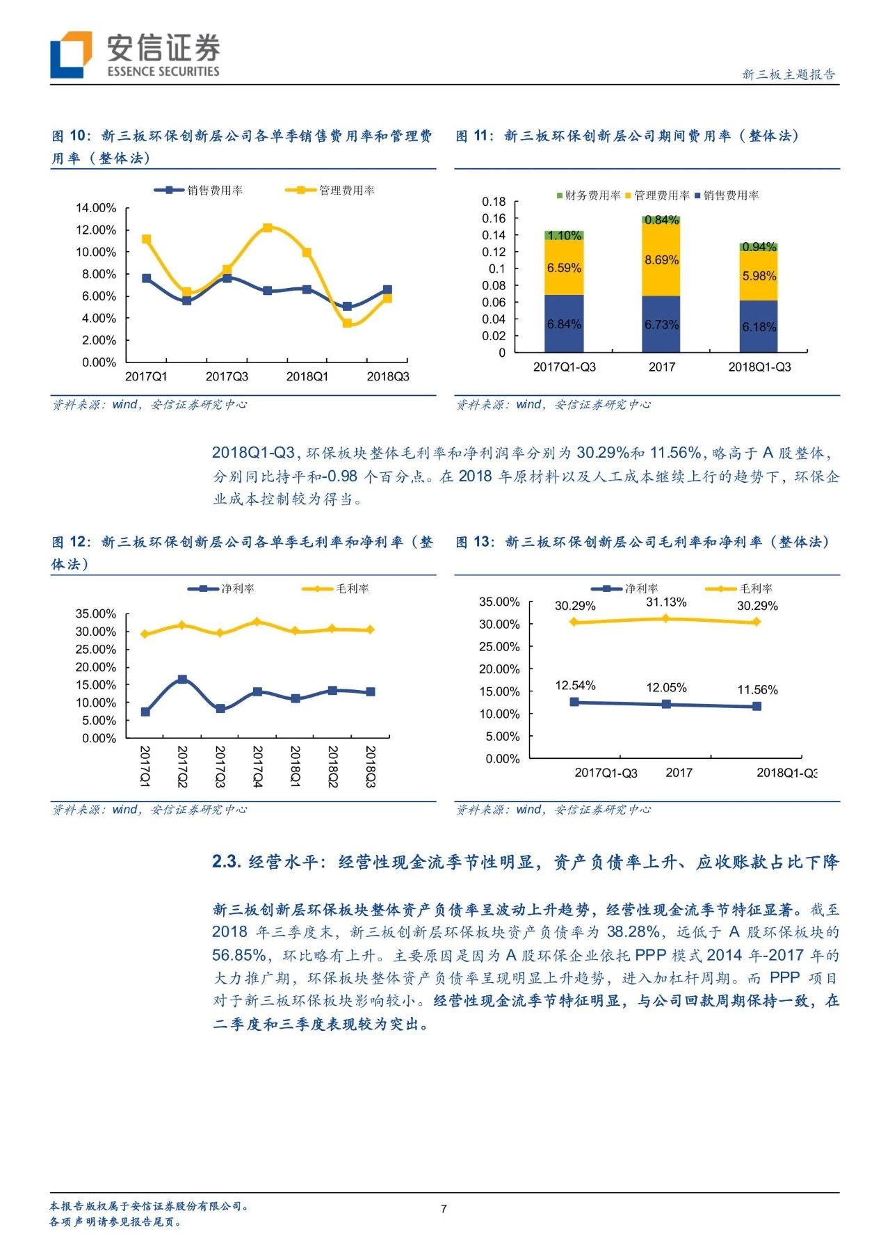 盈利能力:1)期間費(fèi)用:新三板環(huán)保板塊2018年前三季度銷售、管理、財(cái)務(wù)費(fèi)用率分別為6.18%、5.98%、0.94%,同比-0.66、-0.61、-0.16個(gè)百分點(diǎn),銷售、管理費(fèi)用率控制得當(dāng)。財(cái)務(wù)費(fèi)用率低于A股環(huán)保公司(A股為2%-3%),主要原因是因?yàn)锳股以PPP為主要模式,2018年以來利率信用收緊、利率繼續(xù)上行。2)2018Q1-Q3,新三板環(huán)保板塊整體毛利率和凈利率為30.29%、11.56%,略高于A股整體,分別同比持平和-0.98個(gè)百分點(diǎn)。