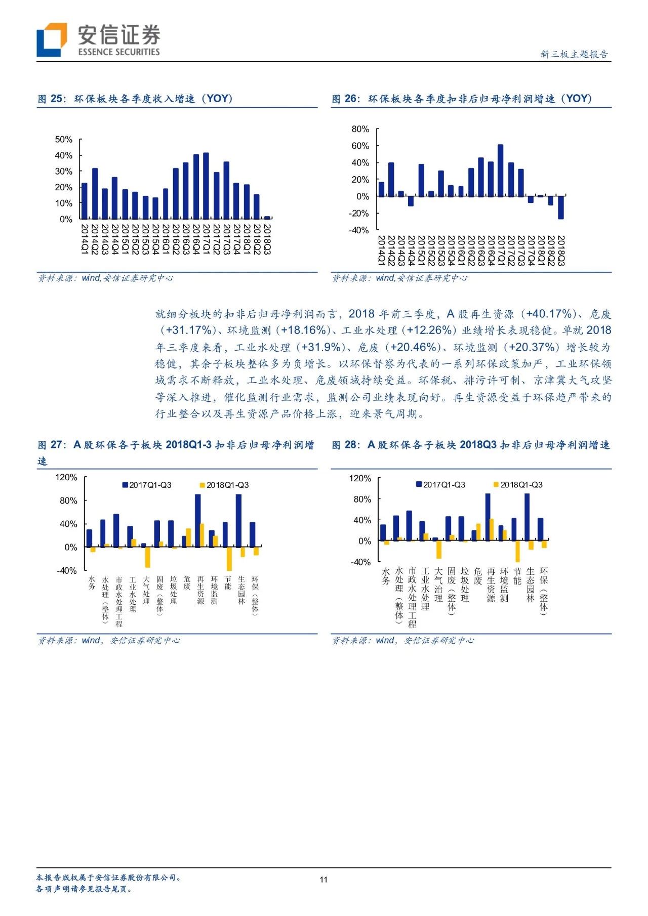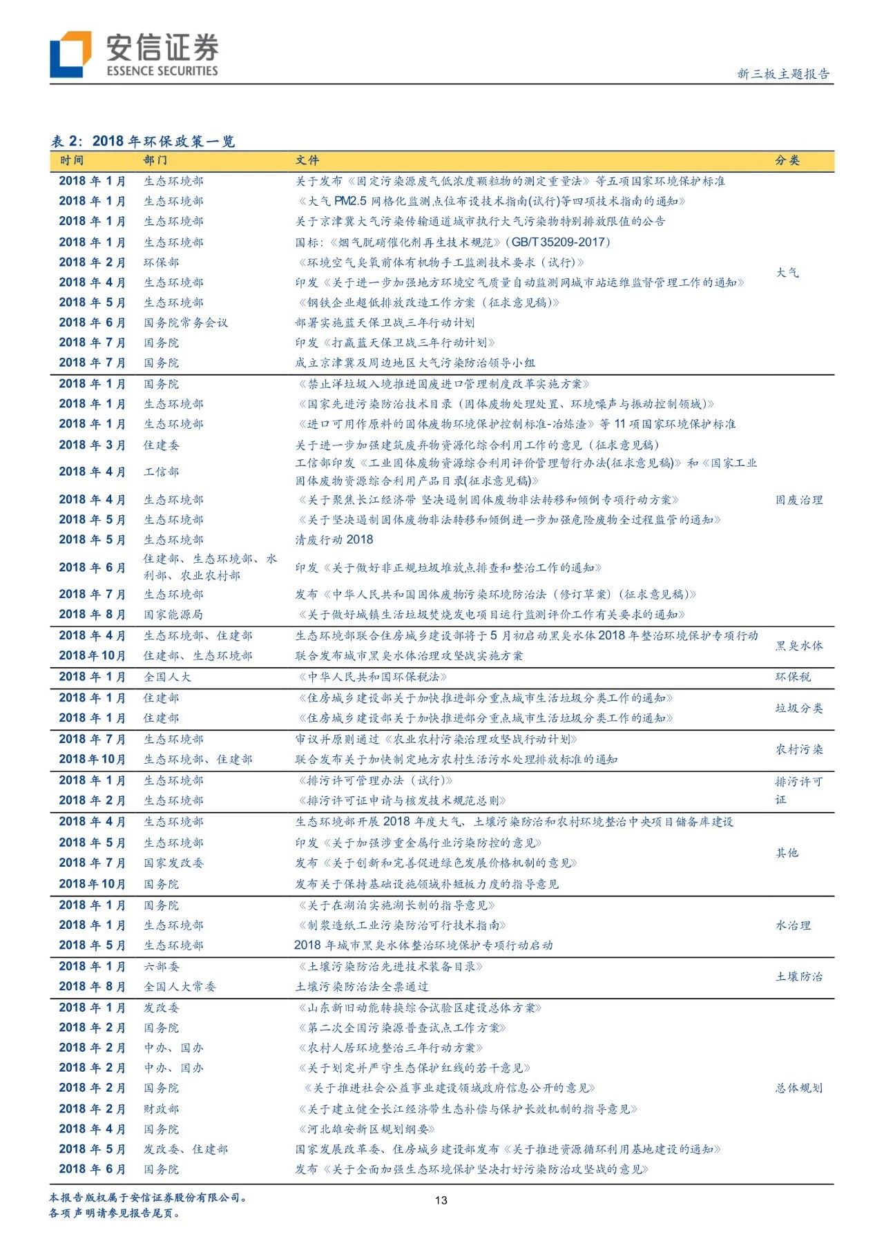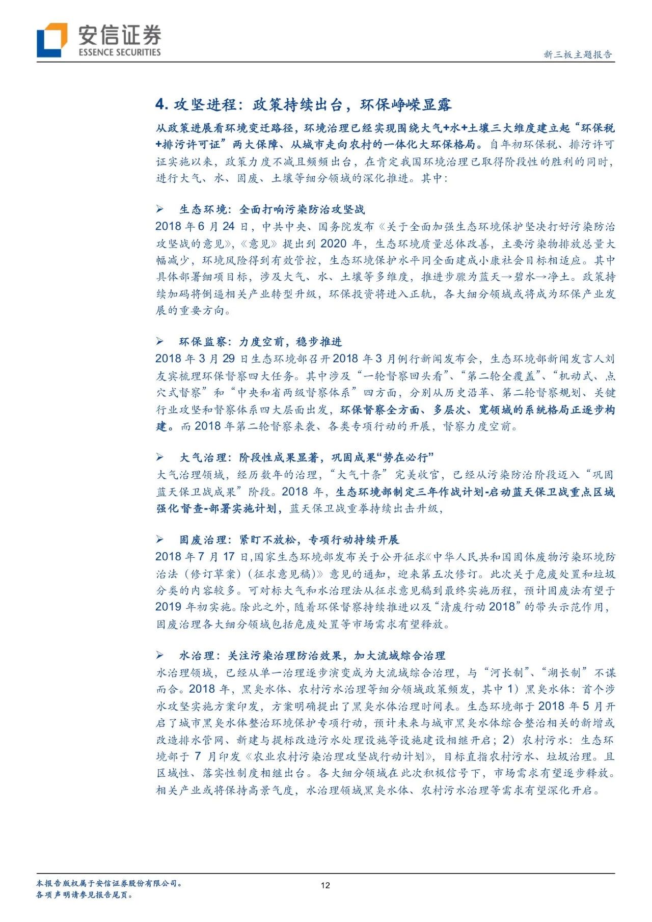 從政策進(jìn)展看環(huán)境變遷路徑,環(huán)境治理已經(jīng)實(shí)現(xiàn)圍繞大氣+水+土壤三大維度建立起“環(huán)保稅+排污許可證”兩大保障、從城市走向農(nóng)村的一體化大環(huán)保格局。自年初環(huán)保稅、排污許可證實(shí)施以來,政策力度不減且頻頻出臺(tái),在肯定我國(guó)環(huán)境治理已取得階段性的勝利的同時(shí),進(jìn)行大氣、水、固廢、土壤等細(xì)分領(lǐng)域的深化推進(jìn)。我們對(duì)于2018年以來各細(xì)分板塊政策及變遷進(jìn)行了梳理。而新三板擁有400家公司,覆蓋了大氣治理、水治理、固廢治理等各個(gè)領(lǐng)域。我們繼續(xù)看好環(huán)保板塊,建議從政策推進(jìn)進(jìn)程中發(fā)掘潛在機(jī)會(huì),建議關(guān)注水治理、固廢治理和再生資源板塊投資機(jī)會(huì)。