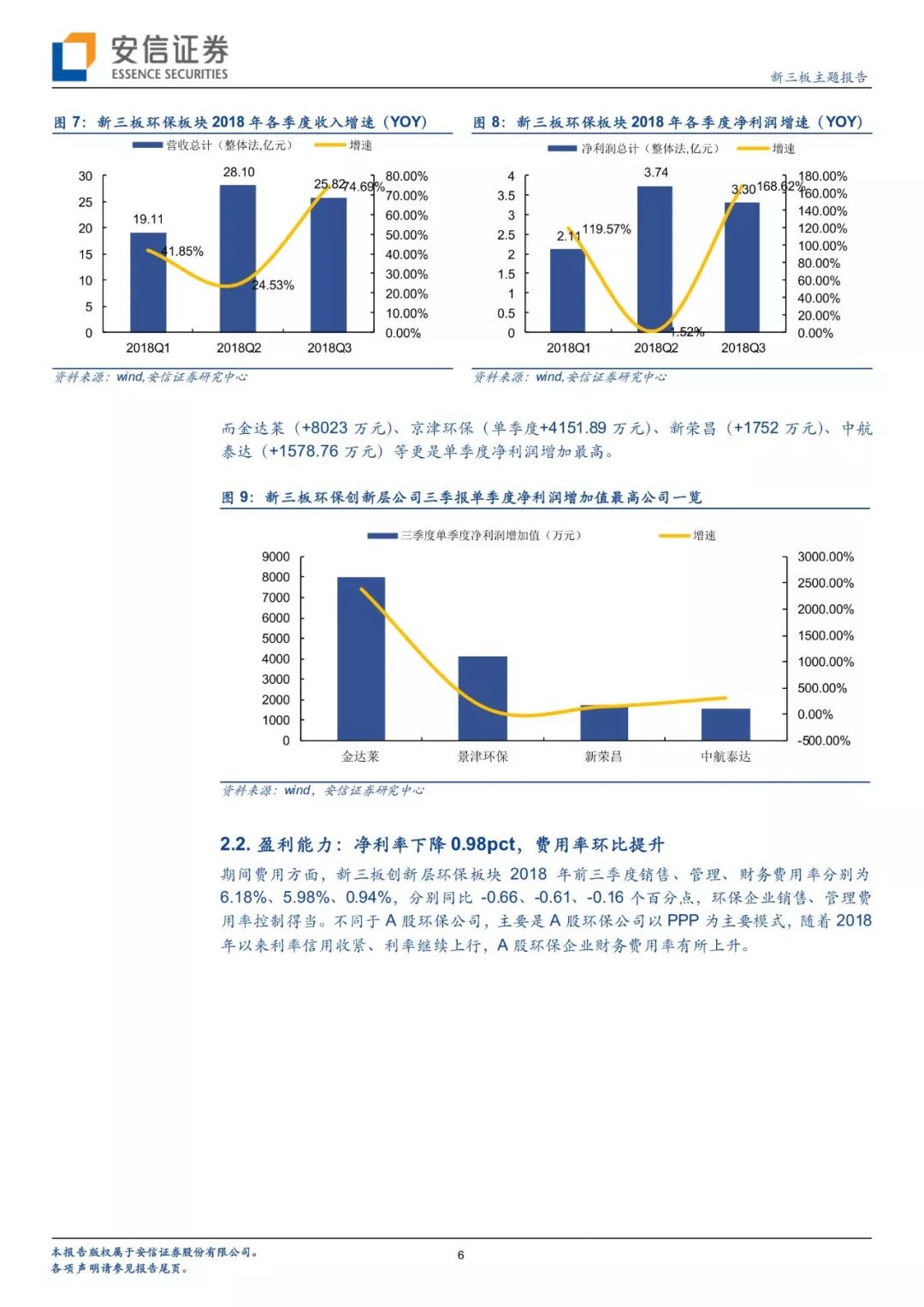 盈利能力:1)期間費(fèi)用:新三板環(huán)保板塊2018年前三季度銷售、管理、財(cái)務(wù)費(fèi)用率分別為6.18%、5.98%、0.94%,同比-0.66、-0.61、-0.16個(gè)百分點(diǎn),銷售、管理費(fèi)用率控制得當(dāng)。財(cái)務(wù)費(fèi)用率低于A股環(huán)保公司(A股為2%-3%),主要原因是因?yàn)锳股以PPP為主要模式,2018年以來(lái)利率信用收緊、利率繼續(xù)上行。2)2018Q1-Q3,新三板環(huán)保板塊整體毛利率和凈利率為30.29%、11.56%,略高于A股整體,分別同比持平和-0.98個(gè)百分點(diǎn)。