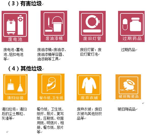 1.居住區(qū)域(居住小區(qū)、公寓區(qū)、別墅區(qū)等生活住宅區(qū)域):一般分為可回收物、廚余垃圾、有害垃圾、其他垃圾四類。