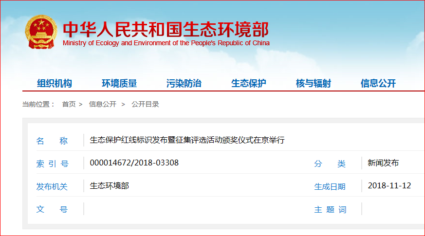 11月12日,生態(tài)環(huán)境部、自然資源部在北京聯(lián)合舉辦生態(tài)保護(hù)紅線標(biāo)識(shí)發(fā)布暨征集評(píng)選活動(dòng)頒獎(jiǎng)儀式,生態(tài)環(huán)境部有關(guān)負(fù)責(zé)同志為標(biāo)識(shí)揭幕并致辭。