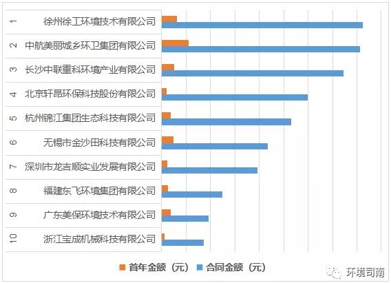 其中:“徐州徐工環(huán)境技術(shù)有限公司、中航美麗城鄉(xiāng)環(huán)衛(wèi)集團(tuán)有限公司、長(zhǎng)沙中聯(lián)重科環(huán)境產(chǎn)業(yè)有限公司、杭州錦江集團(tuán)生態(tài)科技有限公司、深圳市龍吉順實(shí)業(yè)發(fā)展有限公司”等10家公司共中標(biāo)17個(gè)項(xiàng)目,合同總金額49.53億元,中標(biāo)項(xiàng)目首年服務(wù)費(fèi)總金額4.34億元。