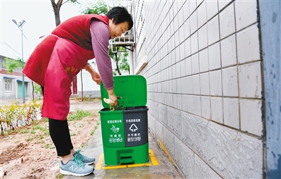 雖然下著雨,但何村社區(qū)滿眼綠樹紅花、處處干凈整潔。村民崔玉玲在自己家中,系著印有“垃圾分類 從我做起”的圍裙,從冰箱取出蔬菜,擇洗完畢后,熟練地拿著要丟棄的菜葉子,扔進了家門口大垃圾桶里標(biāo)著“可腐爛”字樣的綠色小桶里。