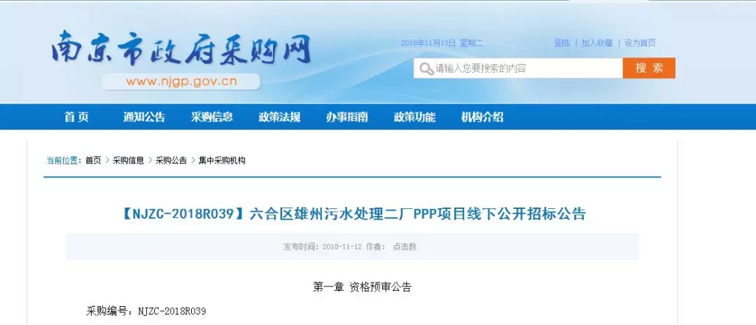11月13日,從南京市政府采購(gòu)網(wǎng)獲悉,六合區(qū)雄州污水處理二廠PPP項(xiàng)目發(fā)布招標(biāo)公告,總投資62097.17萬元。