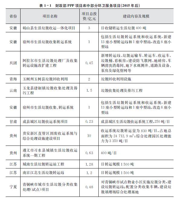2015年開(kāi)始,PPP模式在各地公用市政行業(yè)全面展開(kāi),業(yè)內(nèi)人士稱(chēng)之為PPP元年。伴隨整個(gè)市場(chǎng)大環(huán)境,環(huán)衛(wèi)服務(wù)行業(yè)的市場(chǎng)化也已經(jīng)大幕開(kāi)啟,越來(lái)越多的環(huán)衛(wèi)領(lǐng)域的項(xiàng)目開(kāi)始公開(kāi)招標(biāo)。各地開(kāi)始出現(xiàn)一些分包作業(yè)或者環(huán)衛(wèi)一體化PPP項(xiàng)目,包含垃圾清運(yùn)、道路清掃、設(shè)施維護(hù)等環(huán)衛(wèi)作業(yè)內(nèi)容,或打包招標(biāo)。較為典型的是2015年??谑协h(huán)衛(wèi)一體化建設(shè)全面引入PPP模式項(xiàng)目,4個(gè)區(qū)分別由北京環(huán)衛(wèi)集團(tuán)、龍馬環(huán)衛(wèi)和深圳玉禾田公司中標(biāo)。2015年財(cái)政部建立的PPP項(xiàng)目庫(kù)中首次出現(xiàn)了17個(gè)環(huán)衛(wèi)項(xiàng)目,總規(guī)模約42億元,主要以垃圾清運(yùn)項(xiàng)目為主。截至目前通過(guò)2015年財(cái)政部建立的PPP項(xiàng)目庫(kù)檢索生活垃圾相關(guān)的PPP項(xiàng)目,有多達(dá)202條項(xiàng)目記錄,包含生活垃圾清運(yùn)、轉(zhuǎn)運(yùn)、分揀、終端處理設(shè)施新建和改擴(kuò)建等項(xiàng)目。
