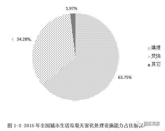2015年全國(guó)城市生活垃圾無(wú)害化處理設(shè)施達(dá)到890座,無(wú)害化處理量為18013.01萬(wàn)噸,比上一年分別增長(zhǎng)8.8%和9.88%。衛(wèi)生填埋、焚燒依舊是我國(guó)采用的垃圾無(wú)害化處理兩種主要方式。其中,衛(wèi)生填埋640座,比上一年增加36座,無(wú)害化年處理量為11483.14萬(wàn)噸,比上一年增加6.88%。生活垃圾焚燒廠220座,比上一年增加32座,無(wú)害化年處理量為6175.52萬(wàn)噸,比上一年大幅增加15.87%。其他類(lèi)型處理設(shè)施30座,比上一年增添4座,無(wú)害化年處理量為354.35萬(wàn)噸,比2014年增加10.88%。填埋、焚燒分別占總無(wú)害化處理量的63.74%、34.28%,“十二五”期間,填埋處理總量比例持續(xù)小幅下降,焚燒廠數(shù)量和處理能力持續(xù)保持明顯上升,其他類(lèi)型處理方式一直未有突破性發(fā)展。