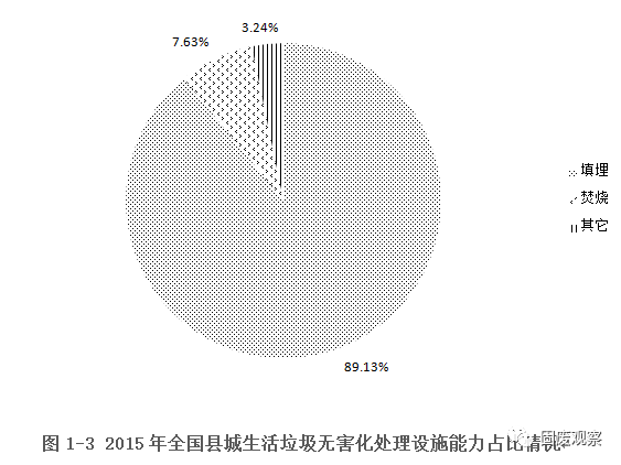 2015全國(guó)縣城生活垃圾無(wú)害化處理設(shè)施共有1187座,無(wú)害化處理量為5259.94萬(wàn)噸,比2014年分別增長(zhǎng)5.14%和10.35%。目前,衛(wèi)生填埋無(wú)論從設(shè)施數(shù)量和處理能力依舊是我國(guó)縣城垃圾無(wú)害化處理最主要方式。2015年衛(wèi)生填埋場(chǎng)1108座,比上一年新增53座;填埋無(wú)害化處理能力157615噸/日,年無(wú)害化處理量為4688.26萬(wàn)噸,占縣城生活垃圾無(wú)害化處理總能力的89.13%,與去年89.41%基本持平。2015,全國(guó)縣城焚燒廠37座,較去年增長(zhǎng)了3座;無(wú)害化處理總量401.43萬(wàn)噸,較2014年的344.1萬(wàn)噸,增長(zhǎng)了16.66%,但占縣城生活垃圾無(wú)害化處理總能力比例只稍微提升了0.41%。其他無(wú)害化處理設(shè)施,2015年縣城共有42座,較2014年的40座,只增長(zhǎng)了2座,總的處理量與2014年相比也只增長(zhǎng)了9.42萬(wàn)噸??h城生活垃圾的處理設(shè)施和能力未發(fā)生明顯變化。