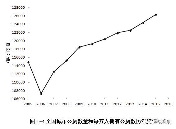 2015年全國(guó)城市公共廁所數(shù)量共有126344座,其中三類(lèi)以上廁所93541座,比2014年分別增長(zhǎng)1.5%和0.49%;三類(lèi)以上公共廁所占全部公共廁所數(shù)量比例由2014年74.83%略微減少至74.04%。目前公廁數(shù)量最多的省份為江蘇、廣東、浙江、河南、黑龍江、河北、上海、山東、北京、遼寧等省。
