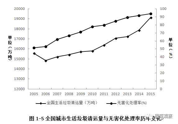 2015年全國(guó)城市共清運(yùn)生活垃圾19141.87萬(wàn)噸,比2014年增加7.18%,清運(yùn)量較以往增速非常明顯。2015年生活垃圾無(wú)害化處理率已達(dá)到94.10%,較2014年91.79%繼續(xù)提升了2.31%,表明生活垃圾采用簡(jiǎn)易處理方式的情況將會(huì)越來(lái)越少。