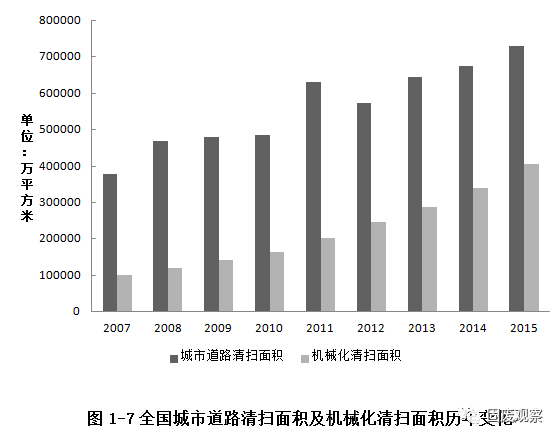 2015年全國(guó)城市道路清掃面積730333萬(wàn)平方米,其中機(jī)械化清掃面積405569萬(wàn)平方米,占全部清掃面積55.53%。全國(guó)城市道路清掃面積累計(jì)比2014年增加8%,機(jī)械化清掃面積比2014年增長(zhǎng)18.9%,道路機(jī)械清掃作業(yè)率繼續(xù)顯著提高。