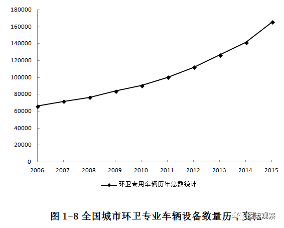 2015年全國(guó)城市環(huán)衛(wèi)專(zhuān)用車(chē)輛設(shè)備總數(shù)達(dá)到165725臺(tái)(輛),比2014年增加24294臺(tái)(輛),增長(zhǎng)率達(dá)到17.18%。2006至2015年的10年期間,環(huán)衛(wèi)專(zhuān)用車(chē)輛總數(shù)平均年增長(zhǎng)率達(dá)到8.51%,持續(xù)保持高速增長(zhǎng)。
