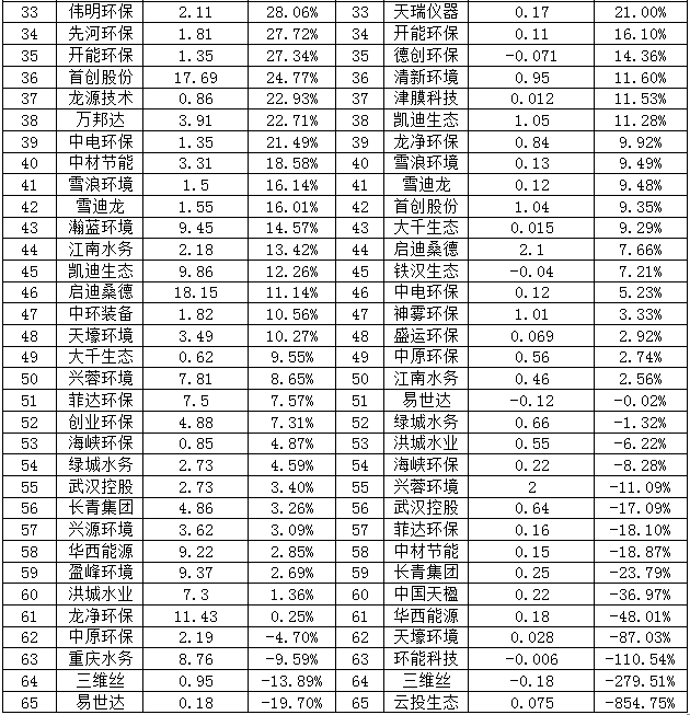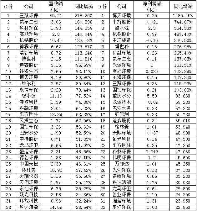 中環(huán)裝備凈利潤虧損0.13億元,居然還能位于D榜的第五,扭虧為盈的能力讓人佩服。不過凈利潤增長主要是子公司中節(jié)能六合天融環(huán)??萍加邢薰经h(huán)境監(jiān)測與大數(shù)據(jù)、大氣治理業(yè)務收入同比增長。而虧損的原因則是傳統(tǒng)脫硫脫硝業(yè)務,相對毛利率較低,并且裝備制造業(yè)務板塊整體利潤同比降低。
