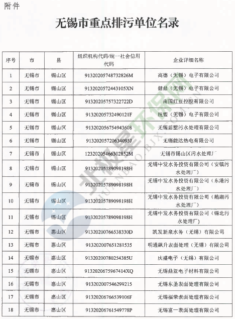無錫市環(huán)境保護局發(fā)布了《關于印發(fā)2018年無錫市重點排污單位名錄的通知》,涉及大氣污染物排放、污水處理及工業(yè)固廢處置等排污企業(yè)共180家,具體內容如下: