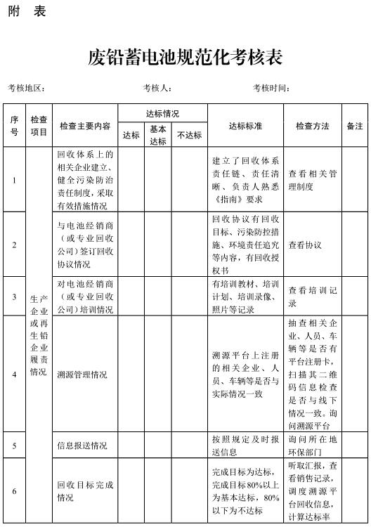 (三)加強(qiáng)督導(dǎo)考評。建立健全督導(dǎo)檢查、考核評價機(jī)制,加強(qiáng)對四個試點市廢鉛蓄電池回收處理體系建設(shè)情況的檢查考核,發(fā)現(xiàn)問題及時督查督辦,不斷修訂、完善制度,推動建立規(guī)范、高效、暢通的回收利用體系。