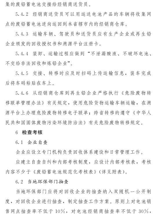 在試點市范圍內(nèi),廢鉛蓄電池在收集網(wǎng)點和經(jīng)銷商倉庫之間轉(zhuǎn)移,可使用鉛蓄電池貨物運(yùn)輸車輛轉(zhuǎn)運(yùn),廢鉛蓄電池自經(jīng)銷商轉(zhuǎn)運(yùn)至持危險廢物許可證的再生鉛企業(yè)、工業(yè)企業(yè)產(chǎn)生的廢鉛蓄電池集中轉(zhuǎn)運(yùn)的,按照危險廢物進(jìn)行管理,運(yùn)行危險廢物轉(zhuǎn)移聯(lián)單,遵守危險貨物運(yùn)輸管理有關(guān)規(guī)定??缡∞D(zhuǎn)移廢鉛蓄電池的,應(yīng)當(dāng)經(jīng)移出地和移入地省級環(huán)保部門批準(zhǔn)。