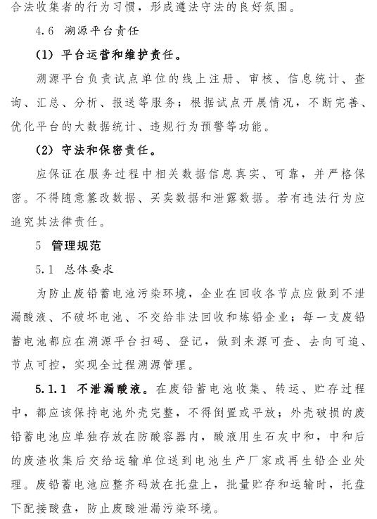 建立廢鉛蓄電池溯源管理平臺,探索廢鉛蓄電池全過程溯源管理模式,實行廢鉛蓄電池全過程線上信息跟蹤。鉛蓄電池生產(chǎn)企業(yè)、經(jīng)銷商、銷售網(wǎng)點、再生鉛企業(yè)及其回收體系、運(yùn)輸企業(yè)等參與廢鉛蓄電池回收的各責(zé)任主體,要在溯源管理平臺注冊登記。參與廢鉛蓄電池回收的各責(zé)任主體收到廢鉛蓄電池后及時粘貼二維碼、掃碼錄入信息,實現(xiàn)廢鉛蓄電池自產(chǎn)生至再生鉛企業(yè)來源可查、去向可追、全程可控的目標(biāo)。