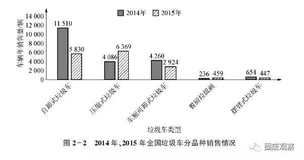 2015年我國垃圾車共完成銷售16386輛,同比下降24.03%。細分品種, 2015年壓縮式垃圾車累計銷量超過6300輛,同比增長55%以上,占2015年全國垃圾車總銷量超過38%,同比提升19%;自卸式垃圾車大幅下降,幅度超過49%,市場份額的下降超過17%;餐廚垃圾車實現(xiàn)快速增長,銷售459輛,同比增長194.23%,市場份額2.80%,同比提升2.08%;擺臂式垃圾車447輛,同比降低31.65%,市場份額2.73%。