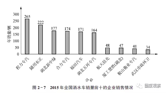 2015年,全國灑水車銷量前10企業(yè)合計銷售灑水車6462輛,同比增長3.54%,市場份額84.01%,同比提升8.63%。其中,程力專汽是2015年全國灑水車銷售企業(yè)中唯一一家灑水車累計銷量超過2000輛且在2400輛以上的企業(yè),同比增長在12%以上,市場份額在31%以上,同比提升5.49%。東風集團排名第二,累計銷量1409輛,市場份額在18%以上。隨州東正累計銷量超過600輛,市場份額近8%,排名第3。其余企業(yè)累計銷量均在500輛以下。