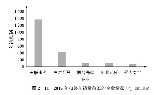 2015年全國銷售掃路車的前5企業(yè)合計銷售掃路車2094輛,在2015年全國掃路車總銷量(下同)中的份額達到85.16%。其中,中聯(lián)重科以1362輛的銷量(同比增長在24%以上)和55.39%的占有份額(同比下降0.42 %)高居行業(yè)榜首,該企業(yè)也是2015年全國銷售掃路車企業(yè)中唯一一家掃路車銷量超過1000輛且在1300輛以上的企業(yè),福建龍馬環(huán)衛(wèi)裝備累計銷量在430輛以上,同比增長91.56%,占有份額在17%以上,排名第二(詳見表2-11),其余企業(yè)累計銷量均在110輛以下。