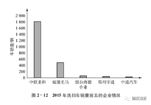 2015年我國洗掃車市場累計銷量前5企業(yè)合計銷售洗掃車2448輛,在2015年全國洗掃車總銷量(下同)中的占有份額合計實現(xiàn)90.67%。其中,中聯(lián)重科累計實現(xiàn)銷量1820輛,是2015年全國銷售洗掃車企業(yè)中唯一一家洗掃車累計銷量超過1000輛且在1800輛以上的企業(yè),同比增長在47%以上,占有份額超過67%,同比下降4.10%,高居全國洗掃車行業(yè)榜首;福建龍馬環(huán)衛(wèi)以累計銷量491輛,18%以上的占有份額屈居第二(詳見表2-12),其余企業(yè)累計銷量均在70輛以下。