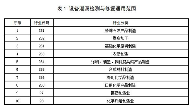 本規(guī)范規(guī)定了設備泄漏檢測與修復的實施范圍、技術方法等要求。本規(guī)范適用于本市表 1中所列行業(yè)企業(yè)含涉揮發(fā)性有機物物料設備的泄漏排放管理。