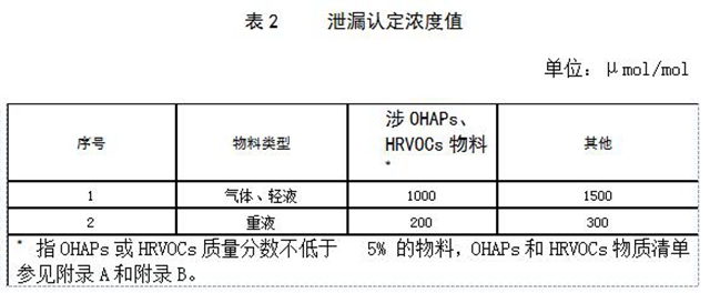 泄漏檢測值大于或等于表 2規(guī)定的泄漏認定濃度值時,即認定發(fā)生了泄漏。泄漏設備應即時系掛泄漏標識牌。泄漏檢測值小于 20,000 μmol/mol時系掛黃色標識牌,泄漏檢測值大于或等于 20,000μmol/mol時系掛紅色標識牌。