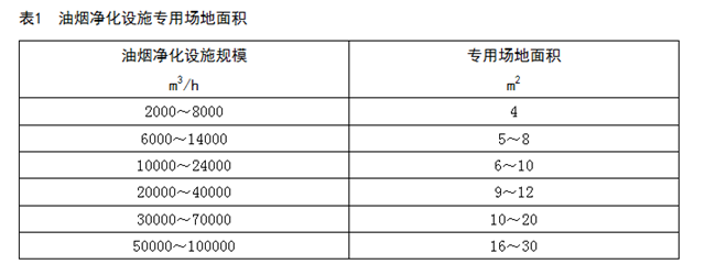6.3.1 二級油煙凈化設施、除味設施、排風機和排氣筒等應安裝在凈高不低于1.5 m的專用場地內,并在維護側留有不少于0.45 m的作業(yè)距離。油煙凈化設施專用場地預留面積參見表1。