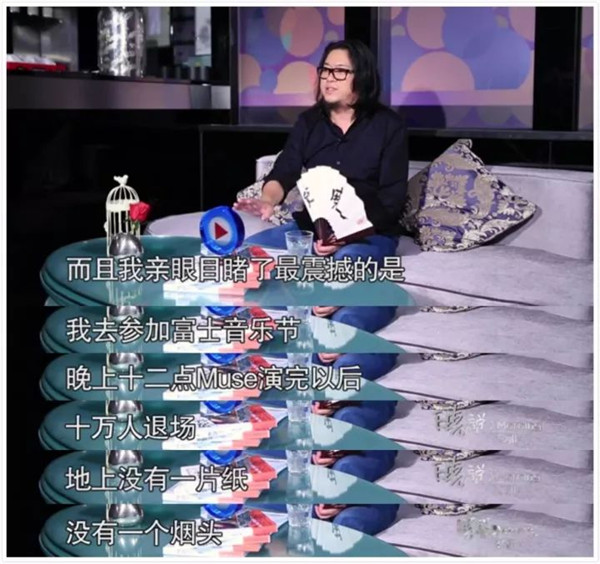 矮大緊老師曾在節(jié)目中提到過,自己去東京參加富士音樂節(jié),活動結(jié)束時(shí)讓他感到非常震撼,十萬人退場地上竟然沒有一點(diǎn)垃圾。更還有一些標(biāo)榜自己“個(gè)性十足”的粉絲在午夜排起長隊(duì)等候扔垃圾。