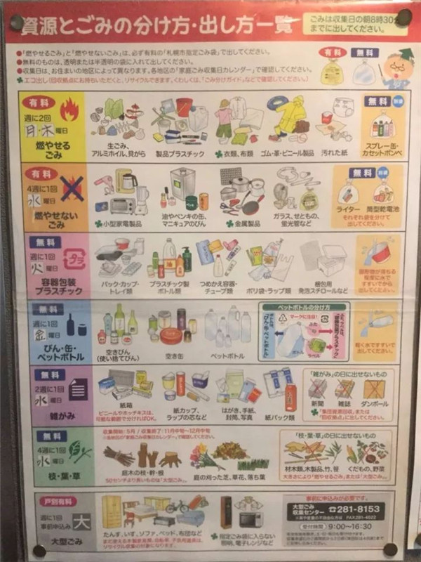 垃圾分類的大方向是以下幾類:可燃垃圾,不可燃垃圾,舊紙類,玻璃瓶,罐,塑料瓶,這個(gè)基本上全日本沒什么太大的差別。