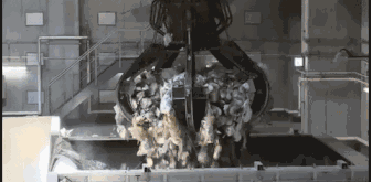 機(jī)械手把垃圾混合均勻后,可燃的垃圾被大爪子抓起來放進(jìn)燃燒爐。