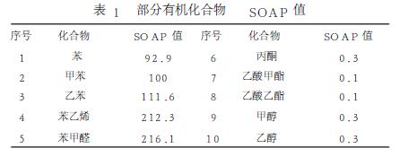 揮發(fā)性有機化合物(VolatileOrganicCompounds,簡稱VOCs)一般指沸點低于250℃的化學(xué)物質(zhì),是最為常見的大氣污染物,其主要來源于化工、制藥、石油、皮革、噴涂等行業(yè)排放的有機溶劑廢氣,包含脂肪烴、鹵代烴、硫烴、芳香烴、有機酸等。這些有機廢氣不但對環(huán)境質(zhì)量、人體健康、動植物生產(chǎn)等造成極大的直接危害,且在光氧化反應(yīng)下,易形成二次有機物氣溶膠(SecondaryOrganicAerosol,簡稱SOA),導(dǎo)致光化學(xué)煙霧、酸雨、霾和氣候變化等一系列環(huán)境問題的產(chǎn)生,這些揮發(fā)性有機廢氣在空氣中懸浮匯聚亦是導(dǎo)致PM2.5和PM10數(shù)值不斷上升的原因之一,因而如何削減這些揮發(fā)性污染物至關(guān)重要。Derwent等[1]一直致力于二次SOA的研究,他們通過二次有機氣溶膠生成潛勢(Seconda-ryOrganicAerosolPotential,簡稱SOAP)研究,對多達上百種揮發(fā)性有機化合物進行SOAP計算,具體見表1。