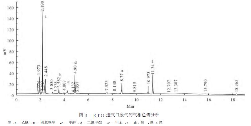 以正丁醇作內(nèi)標(biāo)物,檢測廢氣中乙醚、四氫呋喃、甲醇、二氯甲烷、甲苯共5種組分含量,通過標(biāo)準(zhǔn)樣品分析,確定各個組分停留時間,結(jié)果見圖3和圖4。由圖可見,對各組分出峰面積進行校正,甲醇進氣濃度188mg/m3,經(jīng)RTO氧化焚燒后,甲醇出氣濃度降至9.8mg/m3,削減率94.8%;四氫呋喃進氣濃度121.9mg/m3,經(jīng)氧化焚燒后,出氣濃度降至6.6mg/m3,削減率94.6%;二氯甲烷進氣濃度2079mg/m3,經(jīng)氧化焚燒后,出氣濃度降至97mg/m3,削減率95.3%;同樣,甲苯和乙醚削減率分別達88.0%和96.8%,且排放濃度滿足《大氣污染物綜合排放標(biāo)準(zhǔn)》(GB16297-2012)。