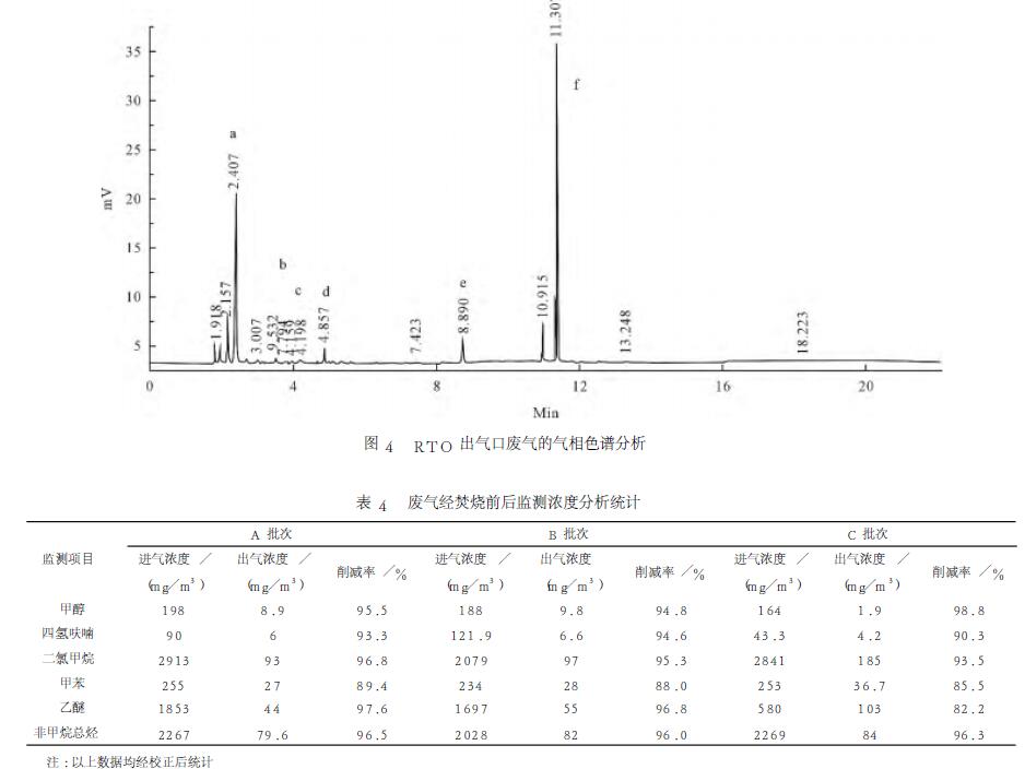 為檢測RTO氧化焚燒對非甲烷總烴削減效率,本文采用氣相色譜儀以火焰離子化檢測器分別測定空氣中總烴及甲烷烴的含量,得出非甲烷烴含量。檢測結(jié)果見表4,非甲烷總烴削減率達96%~96.5%。