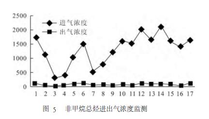 為考察RTO運行性能穩(wěn)定性,運行持續(xù)對該設(shè)備跟蹤研究半個多月,并將RTO進出口非甲烷總烴監(jiān)測濃度進行匯總,研究發(fā)現(xiàn)RTO對總有機廢氣的削減效率達95%以上,具體見圖5。